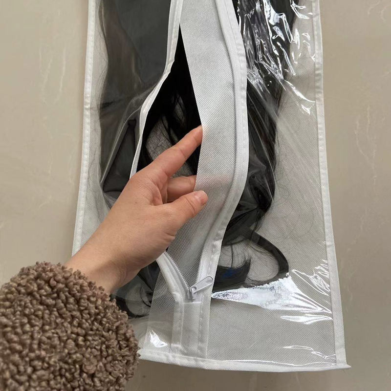 The hair extension bag is made of nonwoven fabric and transparent PVC material,with a hanger hole in top.