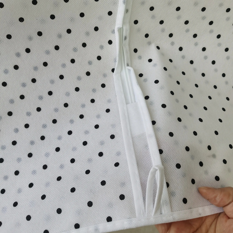 Soft feel, breathable, protective, material. Gorgeous soft pink colour with white dotty pattern or white color with black dotty pattern. Colour run resistant & acid free for safe longer term storage. Protection from moths.
